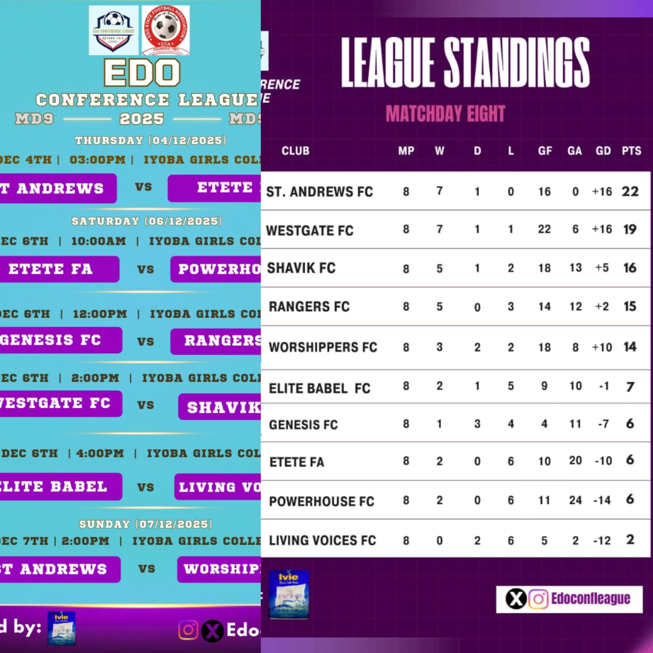 The Edo Conference League has saved its most explosive drama for the final day. Every match has a story, every point has weight, and every team has something on the line to fight for. From the title chase at the top to the fight for survival at the bottom, Matchday Nine promises fireworks, tension, and unforgettable football.