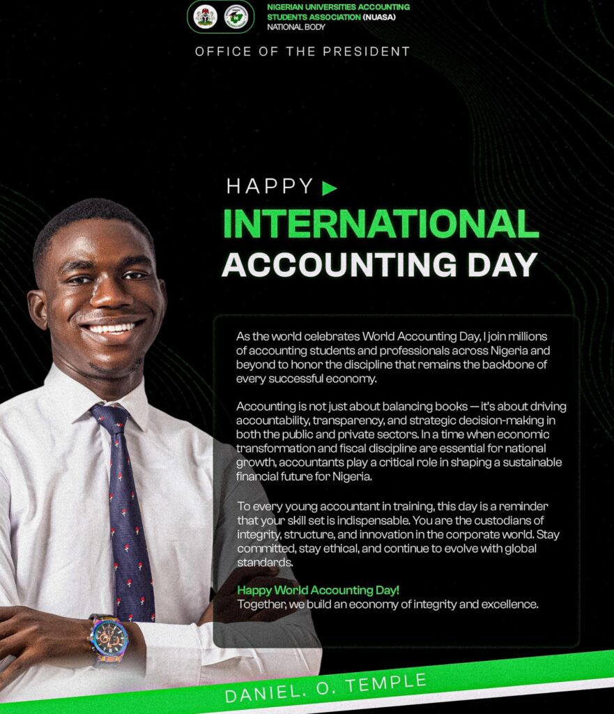 The Nigerian Universities Accounting Students Association, has joined accountants across the world to mark the International Accounting Day 2025, extending heartfelt appreciation to ICAN, ANAN, ACCA, and other professional and industry leaders for their enduring commitment to the growth of the accounting profession and the empowerment of students nationwide, platinumnewsng.com is reporting
