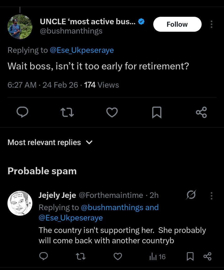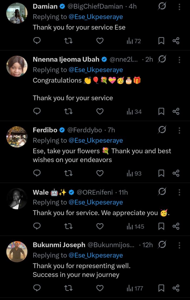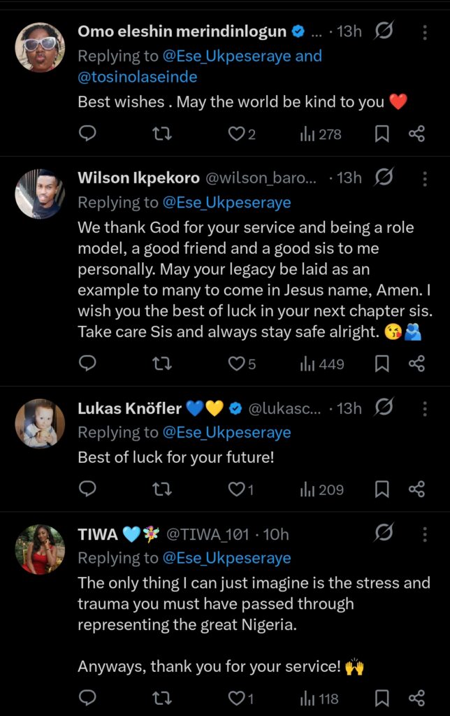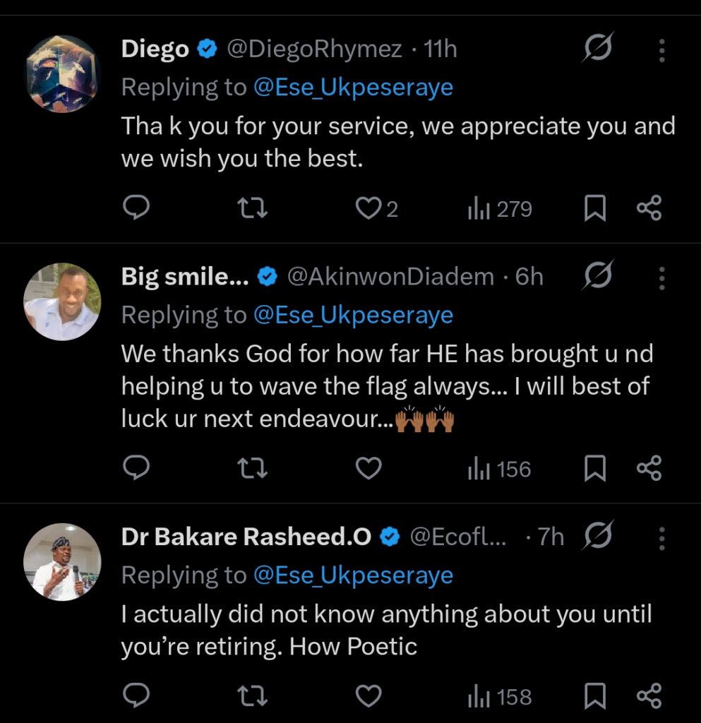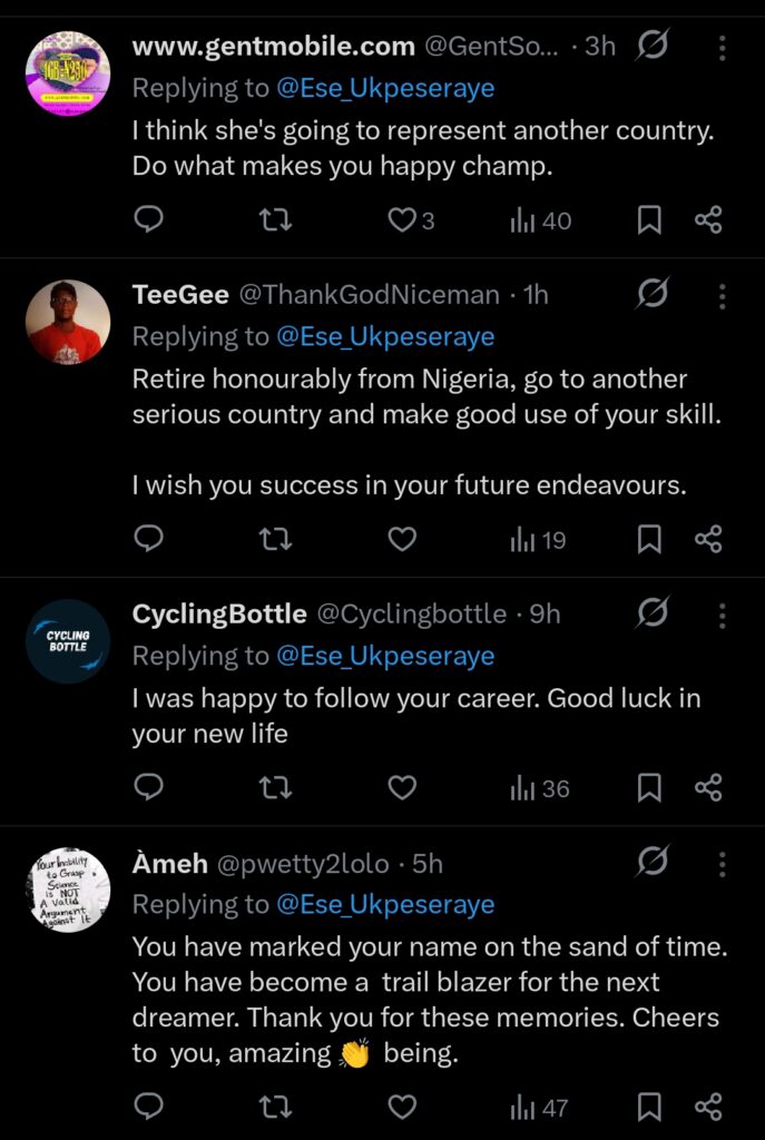 In a statement released on at 9:31 pm Monday February 23rd, Ukpeseraye on her X handle @Ese_Ukpeseraye expressed gratitude and fulfilment as she reflected on her years in the sport.