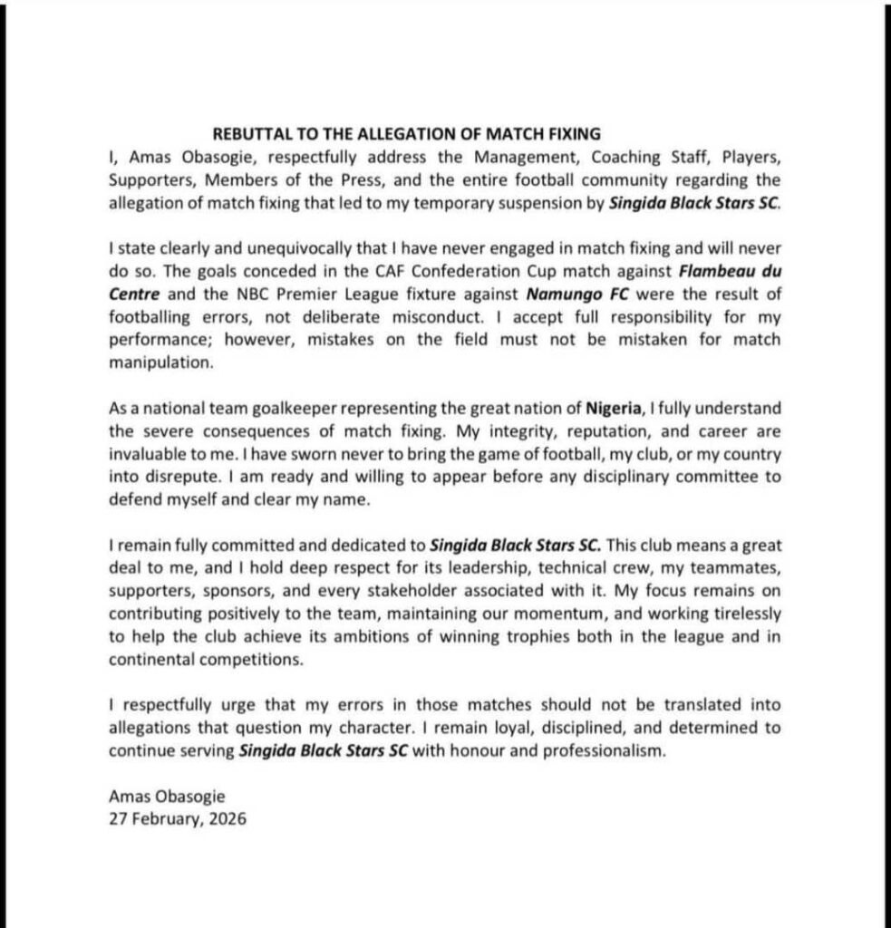 Super Eagles goalkeeper Amas Obasogie has denied any involvement in match-fixing following allegations made by his Tanzanian club, Singida Black Stars, Platinum News is reporting.